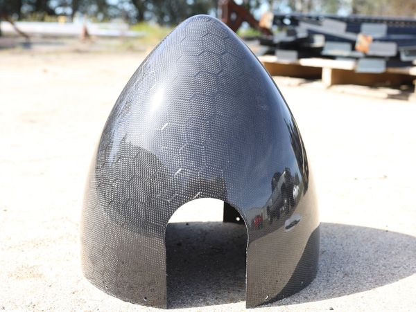 The spinner kit includes a carbon fiber spinner dome, aluminum rear bulkhead and composite self-centering front bulkhead. The spinner dome comes cut to fit the propeller, predrilled with the nut plates installed. The rear bulkhead can flange forward or aft depending on how your cowling was fit. We can do a clearcoat so you can see the Hex carbon weave or paint it.